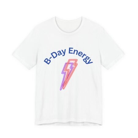 Celebrate special moments with our vibrant Unisex Jersey Short Sleeve Tee. This playful design shouts ‘B-Day Energy’ to bring joy to any celebration. Whether it’s a birthday, graduation, or just a fun day out with friends, this tee is perfect for those who love to express their lively spirit. It’s ideal for anyone who appreciates casual fashion with a pop of personality, suitable for men and women alike. This comfortable top can easily be layered for cooler weather or worn alone in the summer, making it versatile for any occasion. nnGift it to a friend, treat yourself, or wear it proudly at your next gathering to spread positivity and celebration!